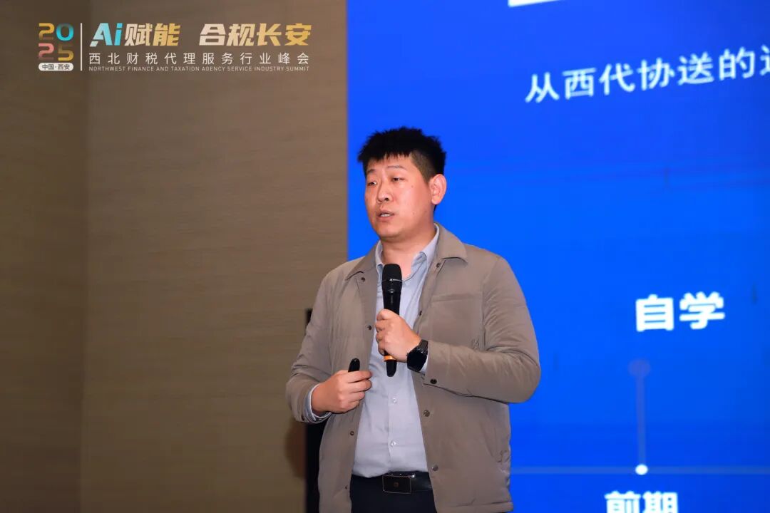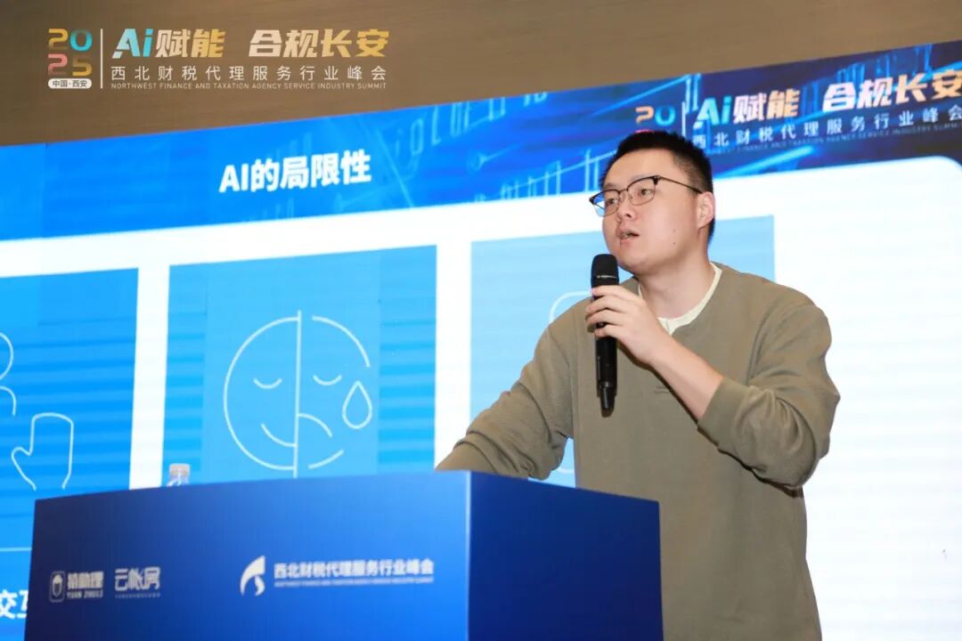 主题分享环节,云帐房AI运营官、AI数智员工教练余少峰率先开讲,深入探讨了《AI时代,代账行业的变革与增长新路径》。