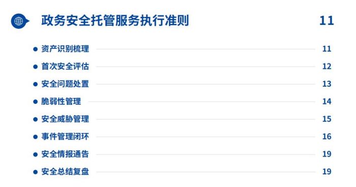 政务MSS在2年多的运行与实践中收获了各级政府单位的支持和认可。为了使政务安全托管这一模式和相关的建设经验得到更大范围的推广,《实践指南》应运而生。具体来说,实践指南归纳总结了政务安全托管服务被验证过的服务流程、执行准则、内容要素及实际效果,为具体的安全托管建设建立了参考依据。