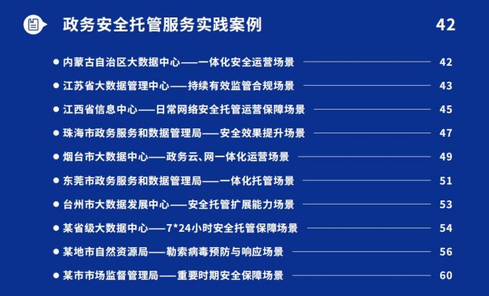 实践指南不但总结了政务安全托管服务的创新模式和规范标准,同时也通过精选10个有代表性的落地案例进行了说明,旨在为全国各级政府单位提供网络安全托管服务建设的详细参考。