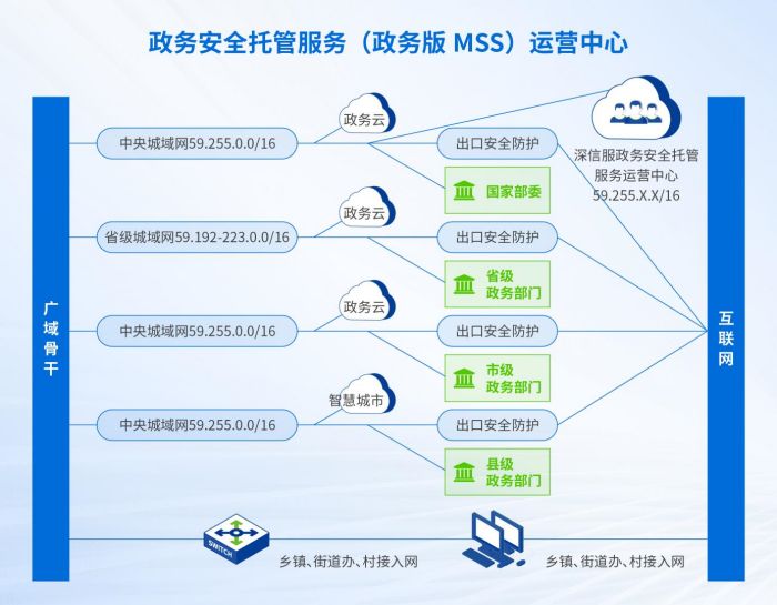 2022年6月,由国家信息中心、深信服联合开展的政务外网安全托管运营服务正式落地,通过部署于电子政务外网专用网络的安全托管服务MSS(政务版)运营中心,7*24小时持续在线守护,围绕“资产、脆弱性、威胁、事件”四个核心安全风险要素的全周期运营,综合提升电子政务外网用户的风险管控能力和安全工作效果。