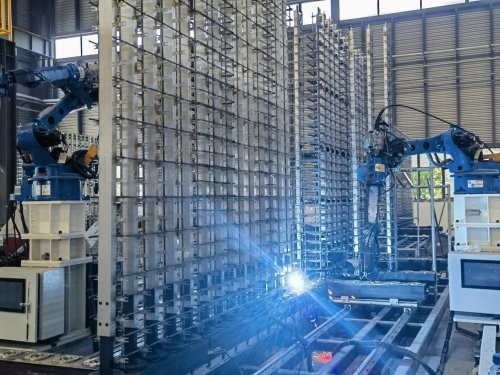 由专用装备和机器人工厂化预制“钢筋骨架+模板+保温+水电集成体”